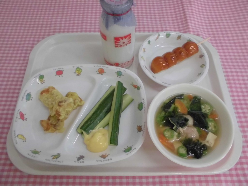竹輪のカレー揚げ・星の子スープ・スティックきゅうり(みそマヨネーズ添え)