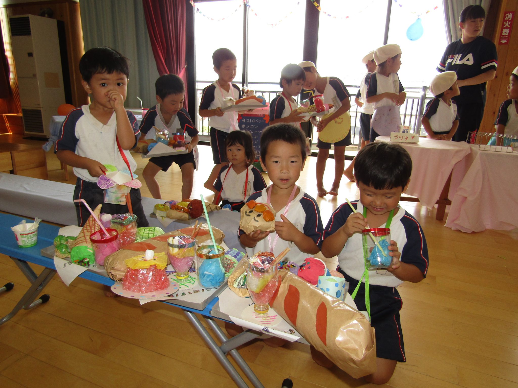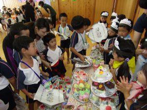品物は各学年工夫して、”どうしたらおいしそうにできるか”や、”本物みたいに作りたい”と一生懸命作る子どもたちでした。出来上がりをみて、おいしそ~!!と、子どもたちの目はキラキラ輝いていました。