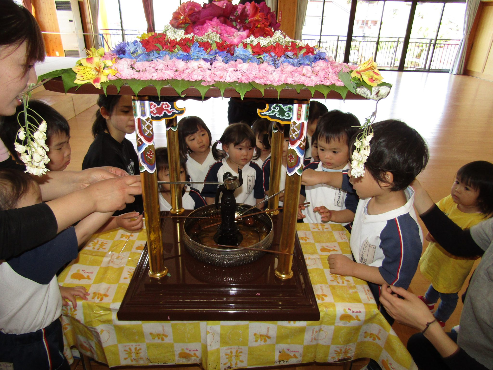 給食時には、みんなで甘茶をいただき、降園時には保護者の方と一緒に甘茶をかけて帰りました。たくさんのお花のご協力、ありがとうございました。