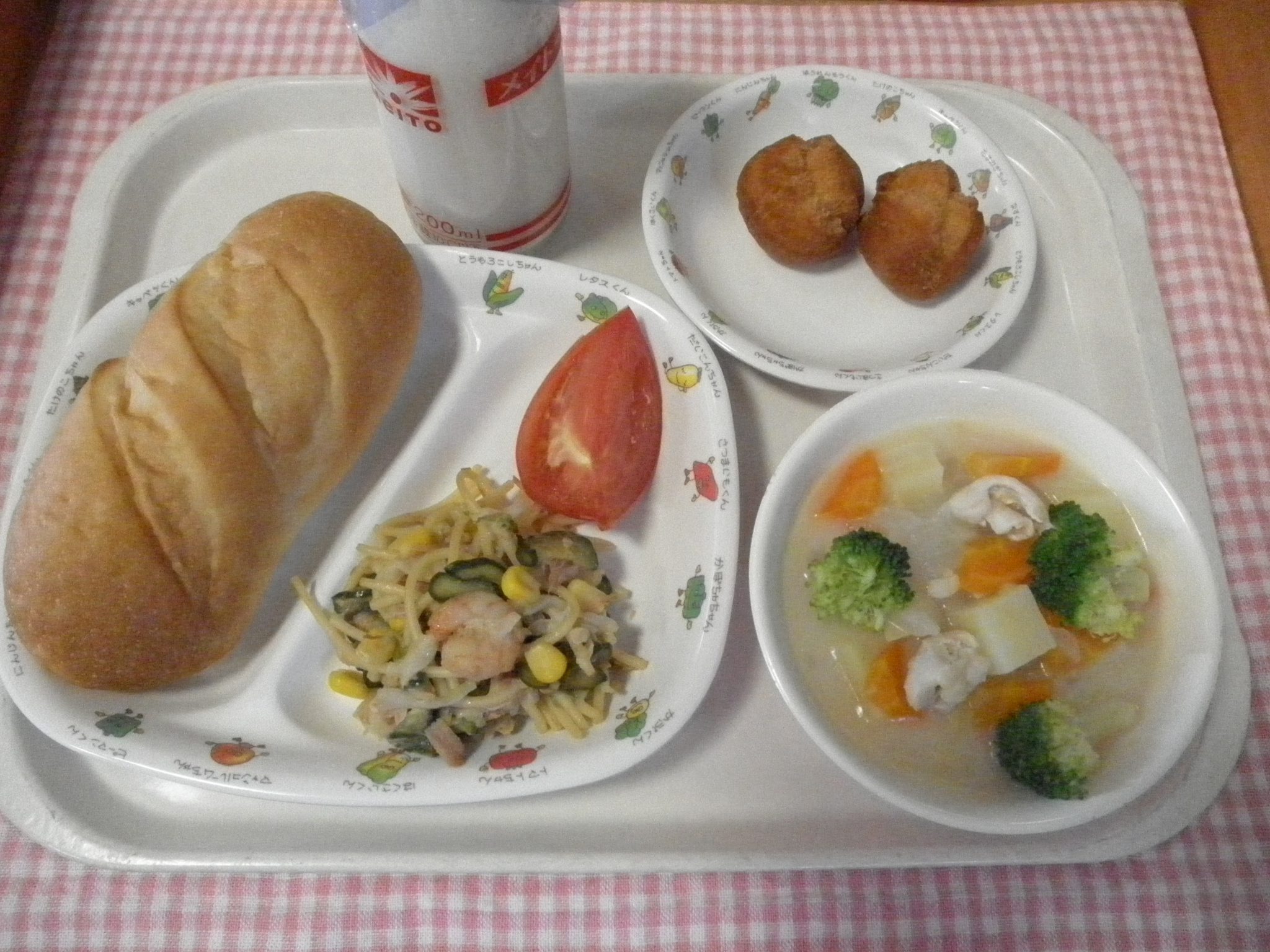 ソフトフランスパン・クリームシチュー・シーフードサラダ・トマト