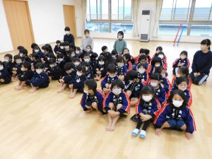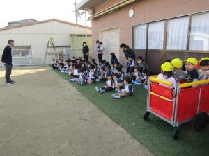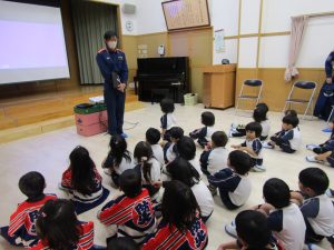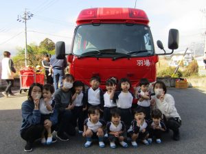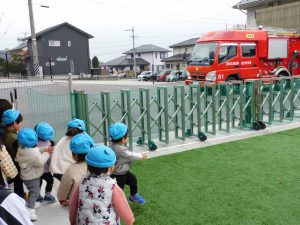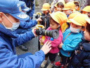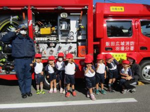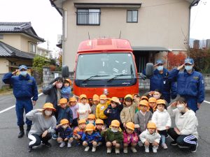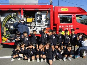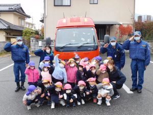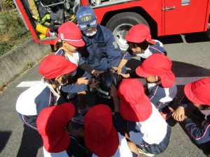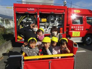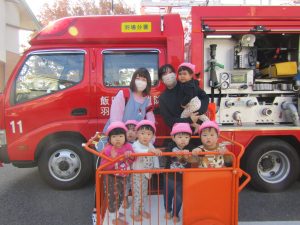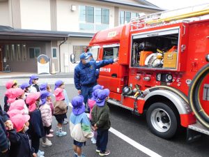寒くなりストーブなど暖房器具を使う季節になりましたが、子ども達は『防火の誓い』を提唱しながら「火災は怖いんだ」ということを学んでいます。その中で消防署の方々立ち会いの下実際に訓練をすることで、より意識も高まっています。消防署の方には園の訓練を見ていただき、更には『おかしもち』〈押さない、駆けない、しゃべらない、戻らない、近寄らない〉を教えていただきました。職員の消火訓練、通報訓練に加え、子ども達はDVDを見たりポンプ車の見学をさせていただいたりすることで火災予防について思いをより強くする時間となりました。