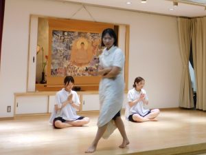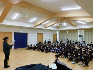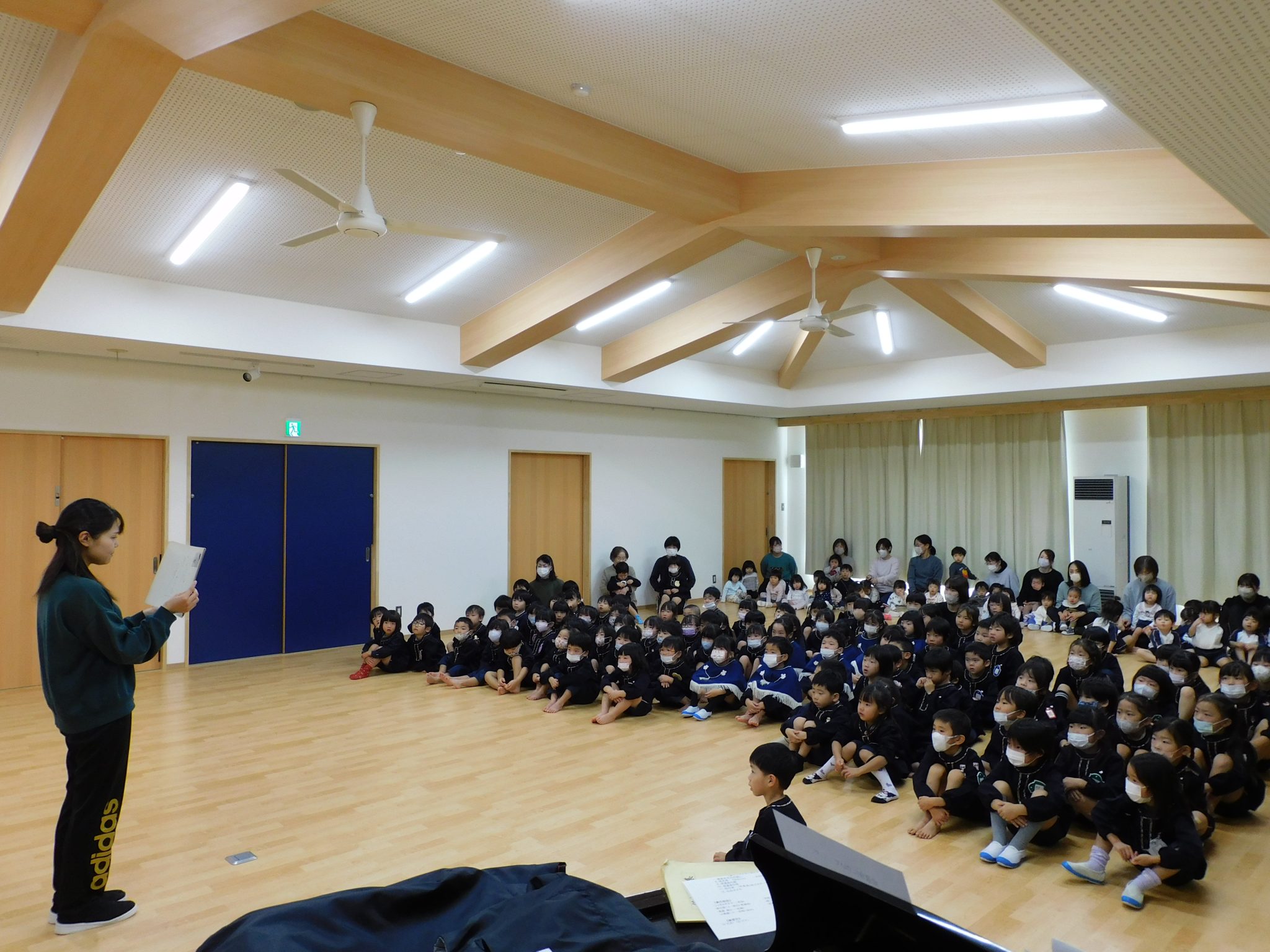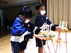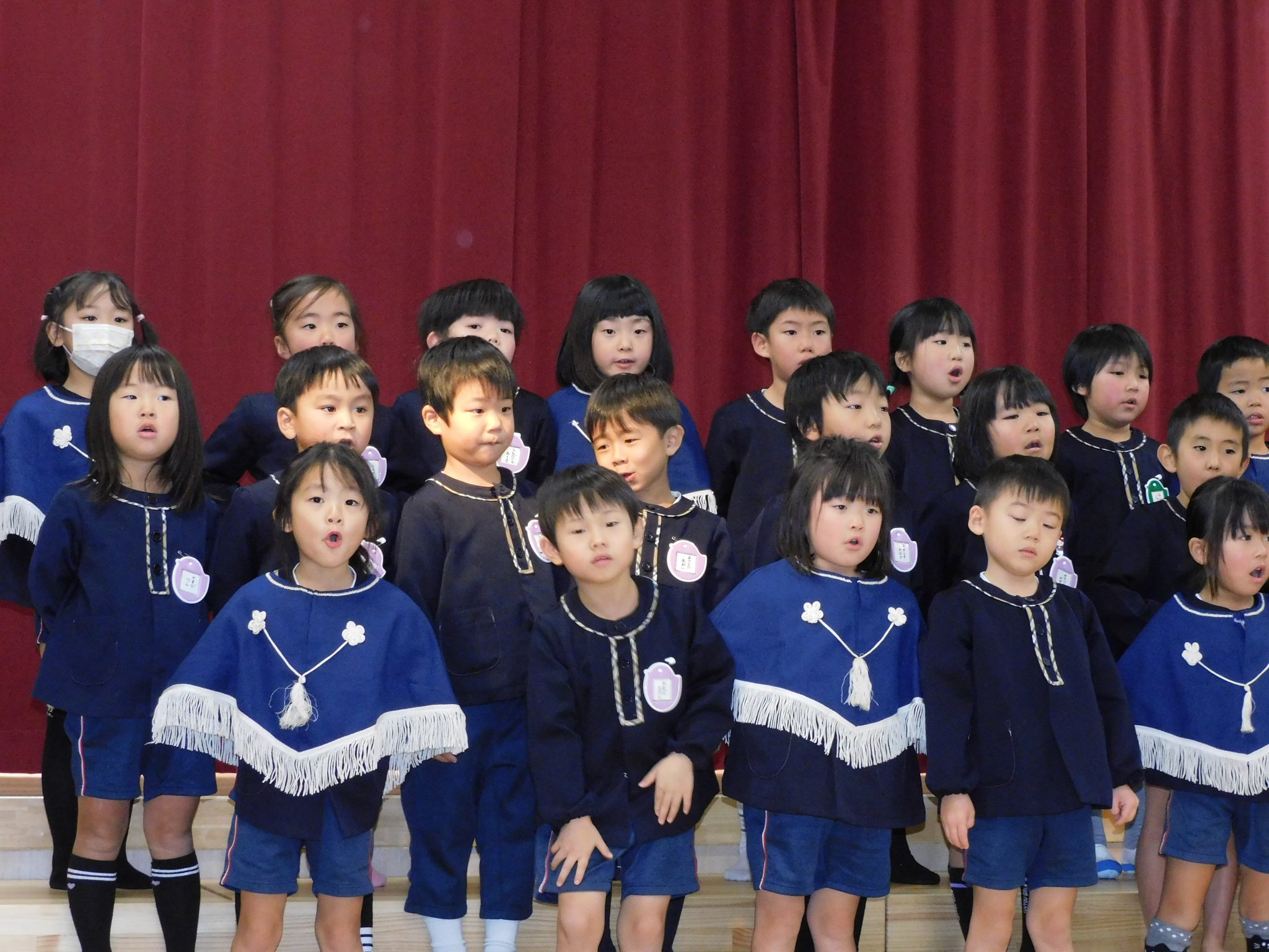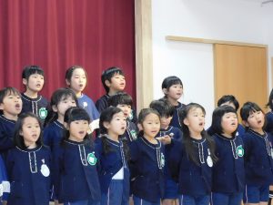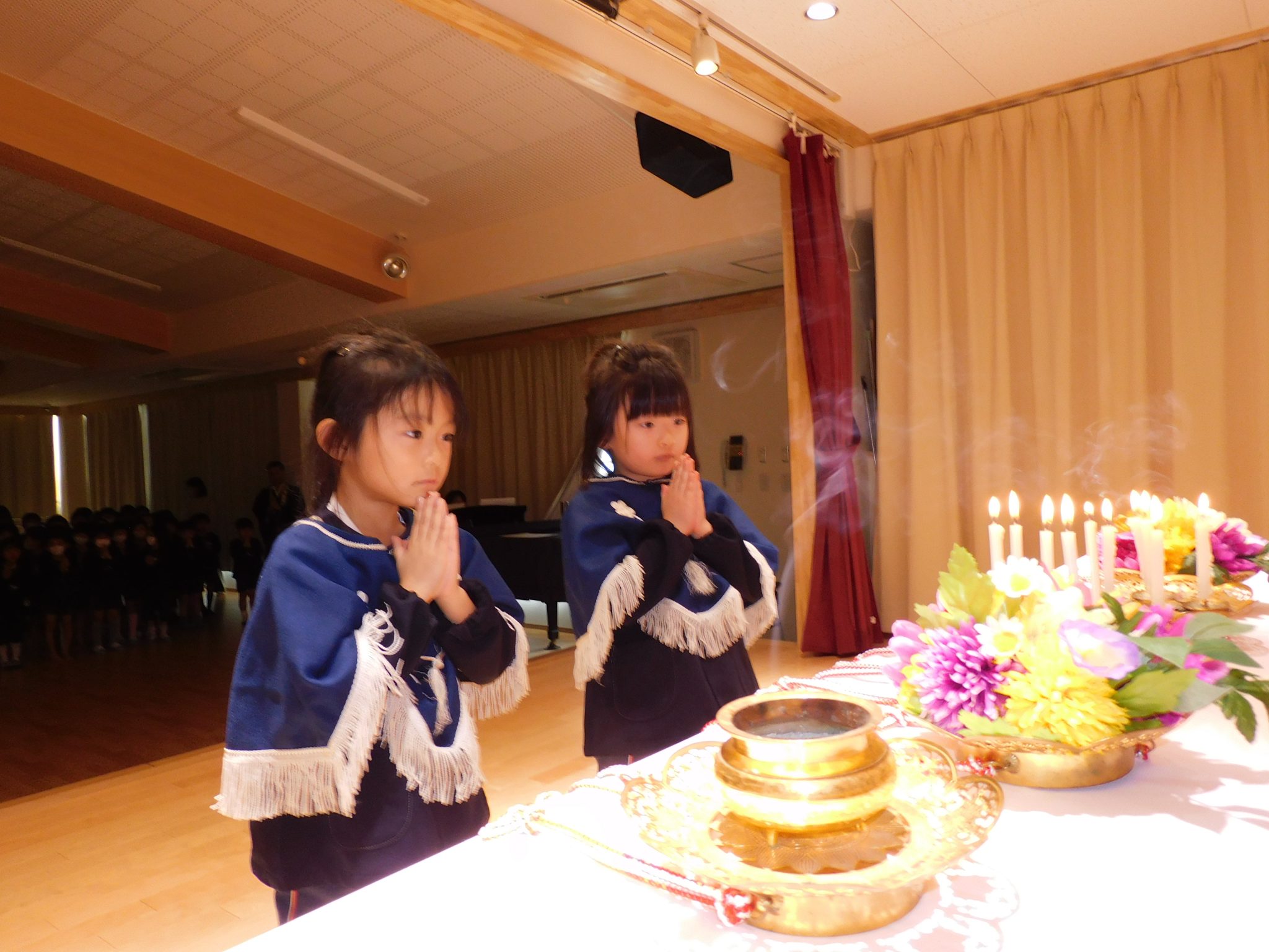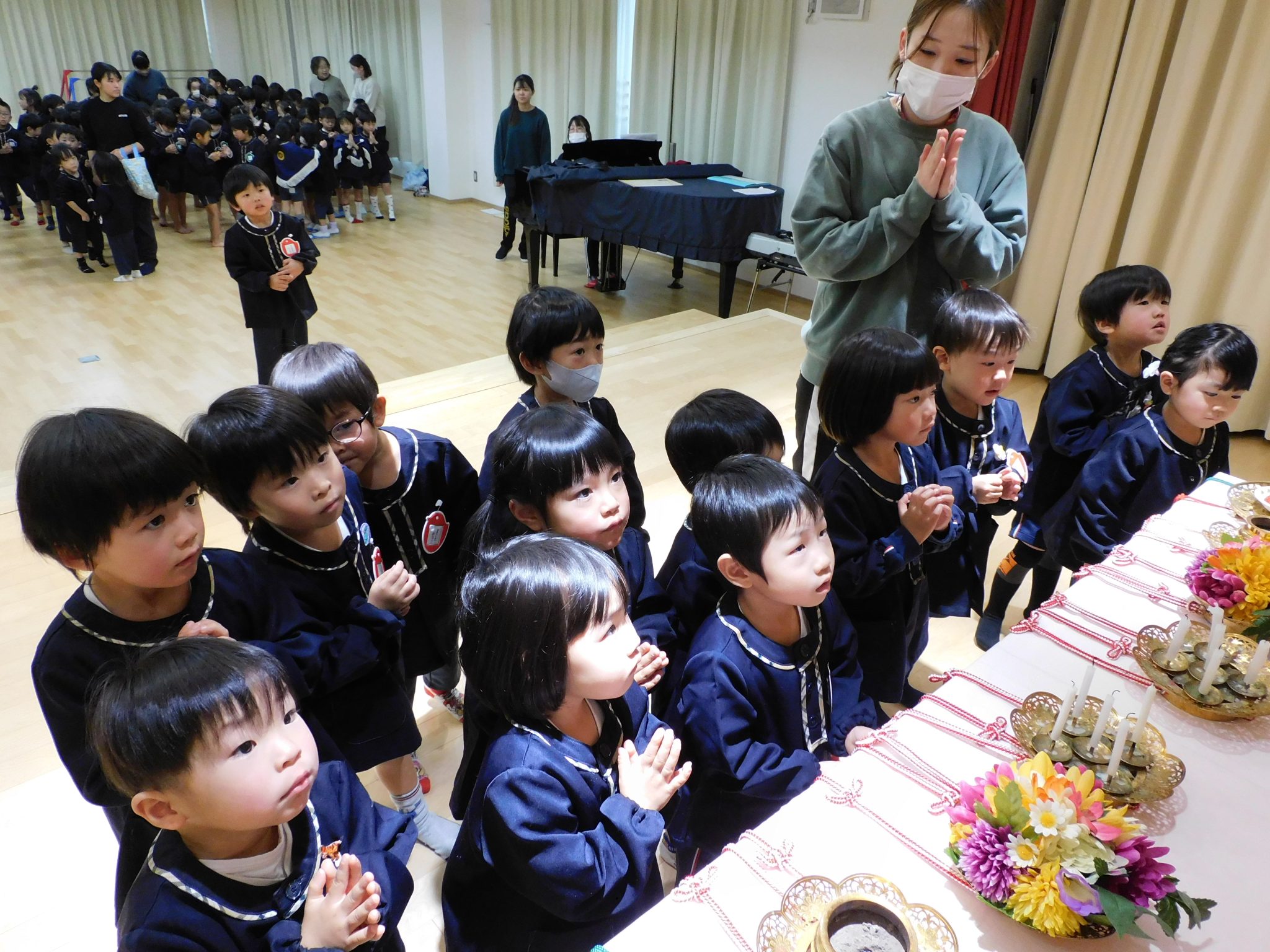 風越・羽場合同で年長児による献灯献花献香でお供えをし、お参りをしました。先生方による劇を見たり、紙芝居を読んでもらったり、最後には年長さんみんなで仏教賛歌「砂の米」を歌って聞かせてくれたりと、あらためて仏教について知るいい機会となりました。