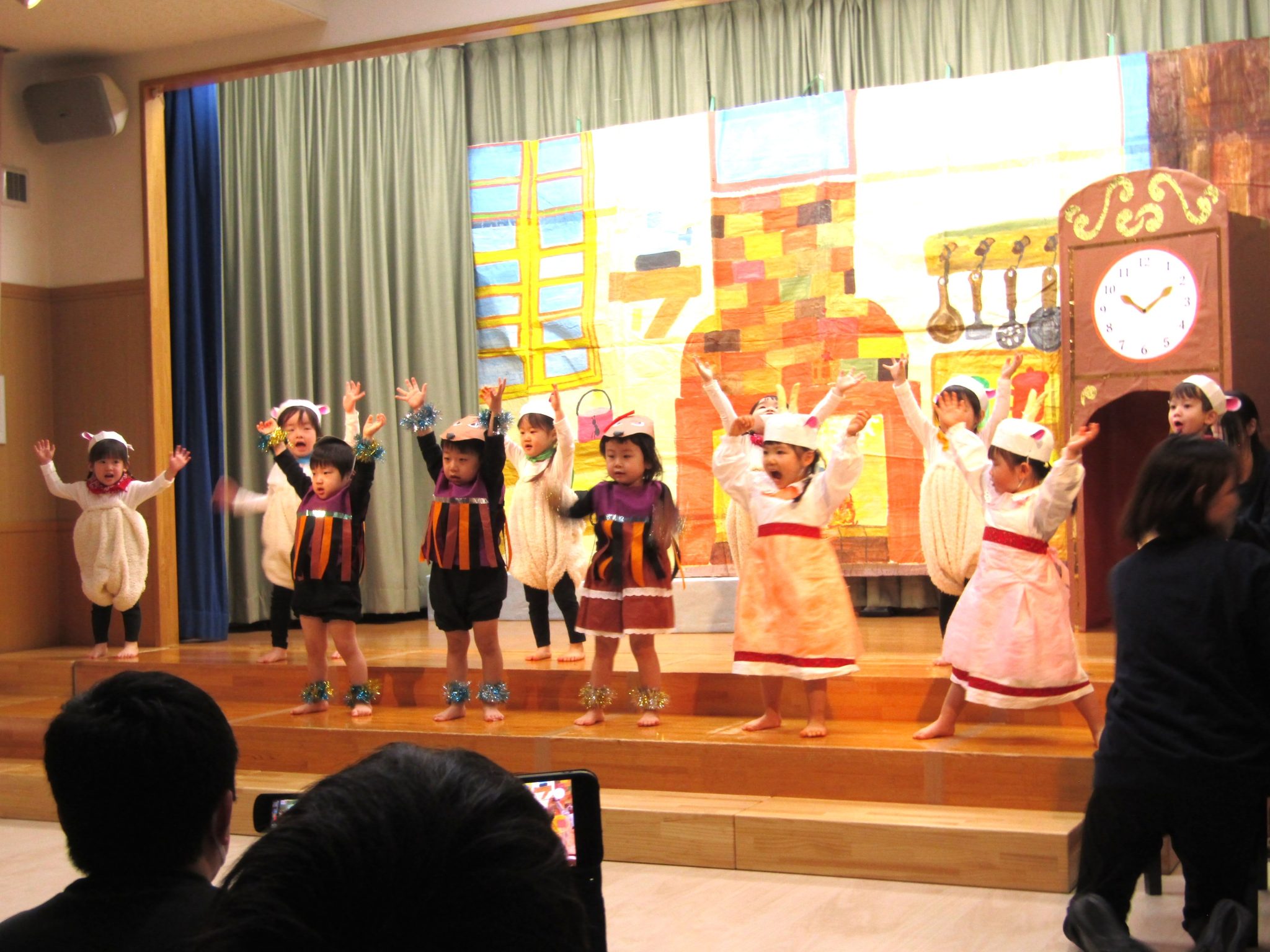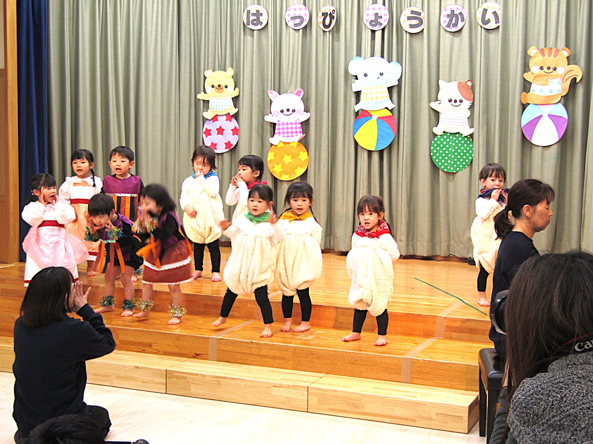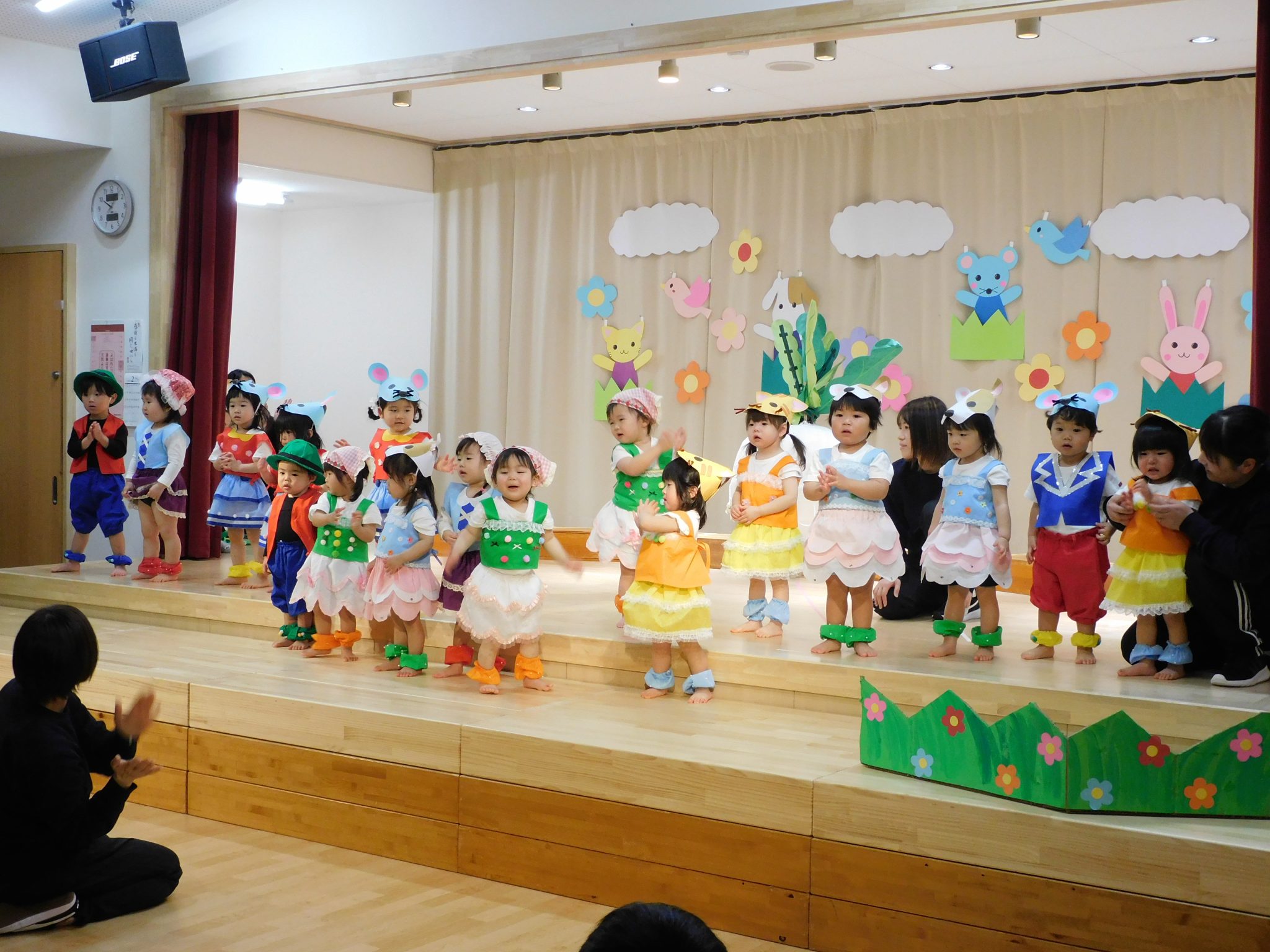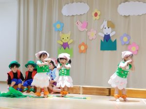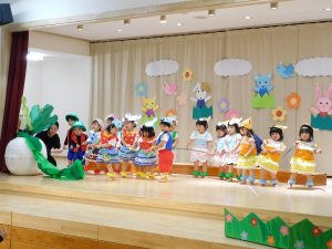 言葉がたくさん出るようになった1才児さん!ステージに上がると緊張した姿も見られましたが、お父さんお母さんの姿をみつけて手を振ったり大きな声でセリフを言ったり、可愛らしく発表することができました。