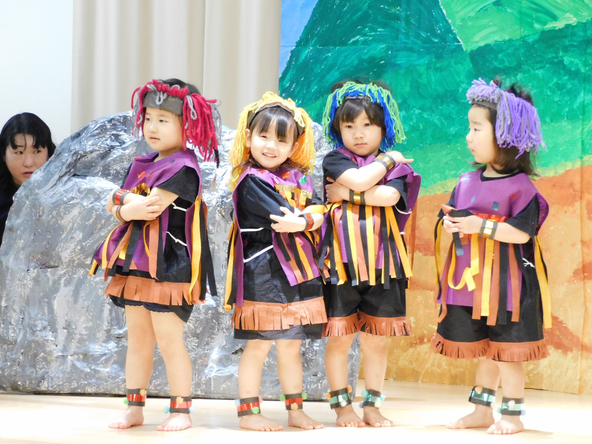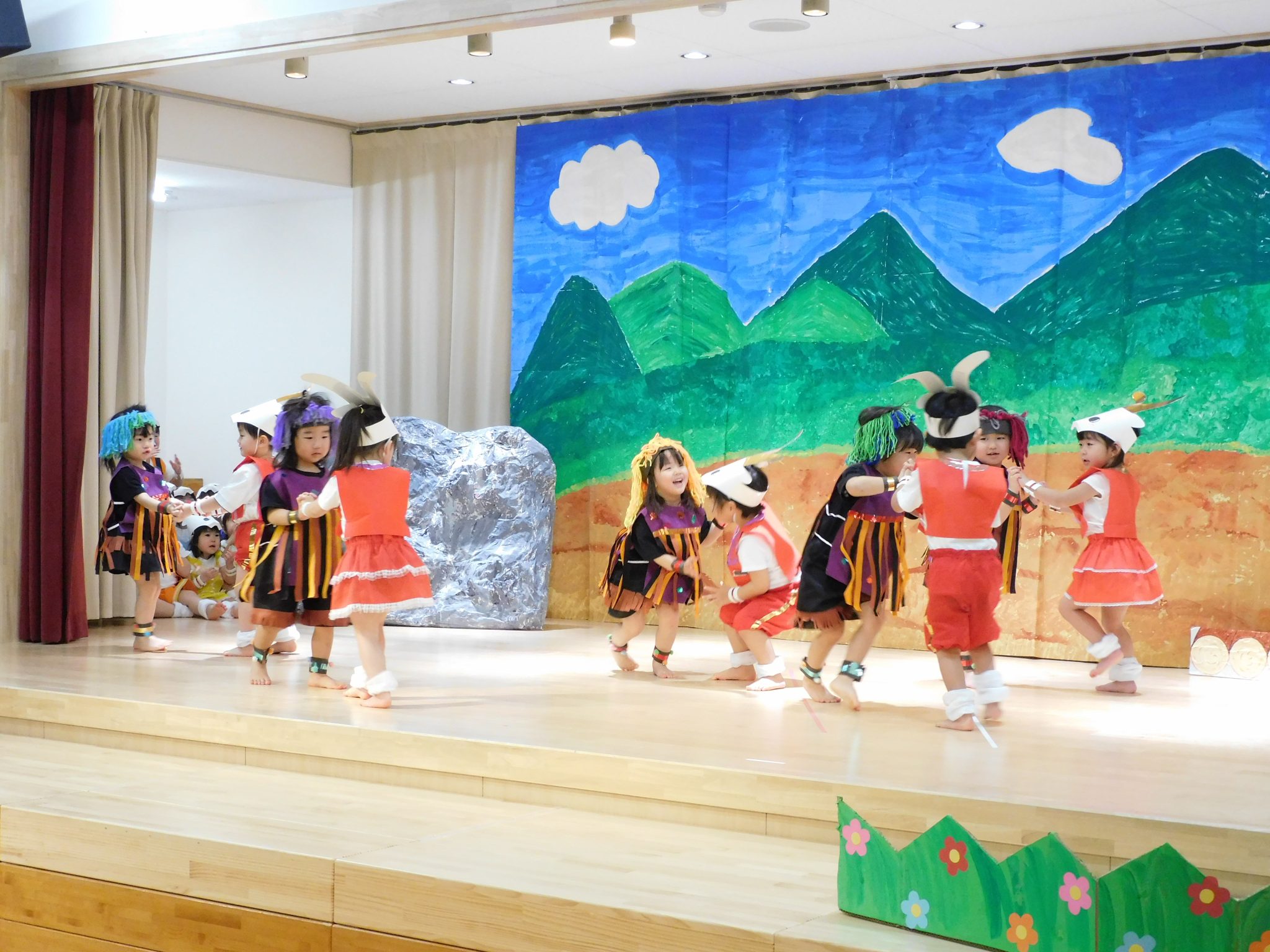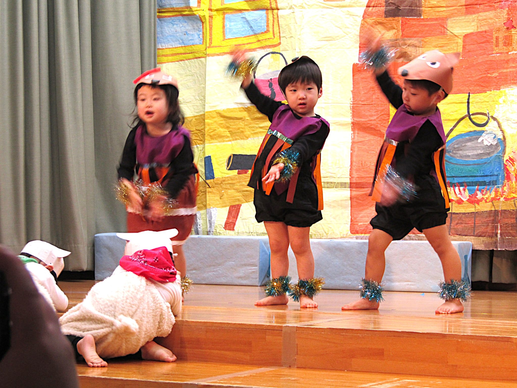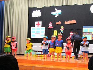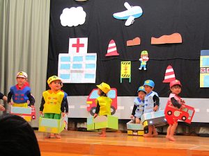 元気いっぱい2才児さん!ひとりひとりが役になりきって堂々と発表ができました。みんなで揃えることの楽しさやできたことの達成感を味わうことができ、みんなで喜びました。